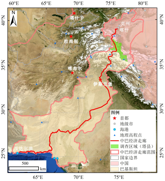 2021年,正值中巴建交70周年。历经70年风云变幻,中巴友谊仍旧牢不可破,坚如磐石。为了更好的发展这份友谊,2013年作为“一带一路”旗舰项目的中巴经济走廊建设正式启动,两国以此为抓手来实现共同发展,共同打造符合两国利益共同体、命运共同体和责任共同体。中巴经济走廊(China-Pakistan Economic Corridor,简称CPEC)北起中国喀什地区,南至巴基斯坦瓜达尔港,全长3000公里,以中巴公路(喀喇昆仑公路)为导向,纵贯帕米尔高原(图1),是一条集公路、铁路、油气管线、光缆和电力线路覆盖的“五位一体”的通道。中巴经济走廊自然环境差异大,地质条件复杂,气候变化明显,地质灾害点多、面广,频发的地质灾害严重威胁中巴经济走廊的建设与民生安全。此次科考地塔什库尔干塔吉克自治县,是中巴经济走廊建设的关键要塞,也是第二次青藏高原综合科学考察研究项目和气候变化背景下中巴经济走廊山地灾害防灾减灾项目的重要研究区域。科学、准确地完善该区域地质灾害目录,厘清地质灾害成因,分析该区域地质灾害危险性,并预测未来气候变化背景下地质灾害的发育,其结果可为该区域防灾减灾和土地利用的合理规划提供基础科学参考,并服务于“一带一路”(中巴经济走廊)的建设。