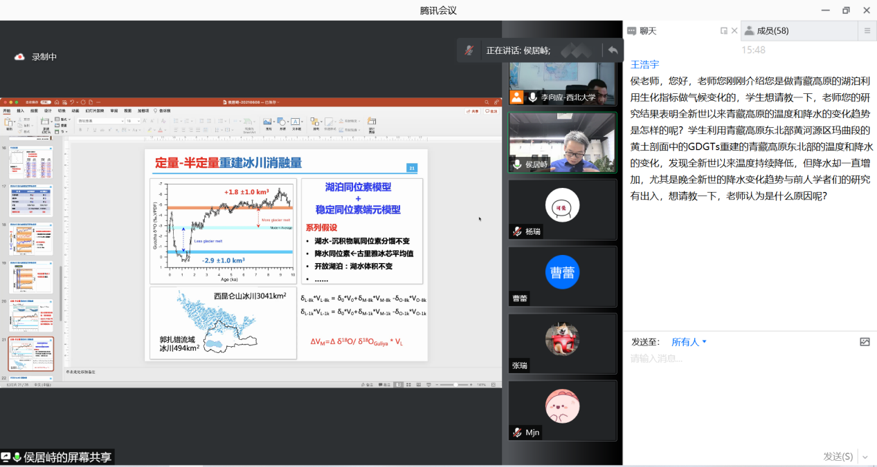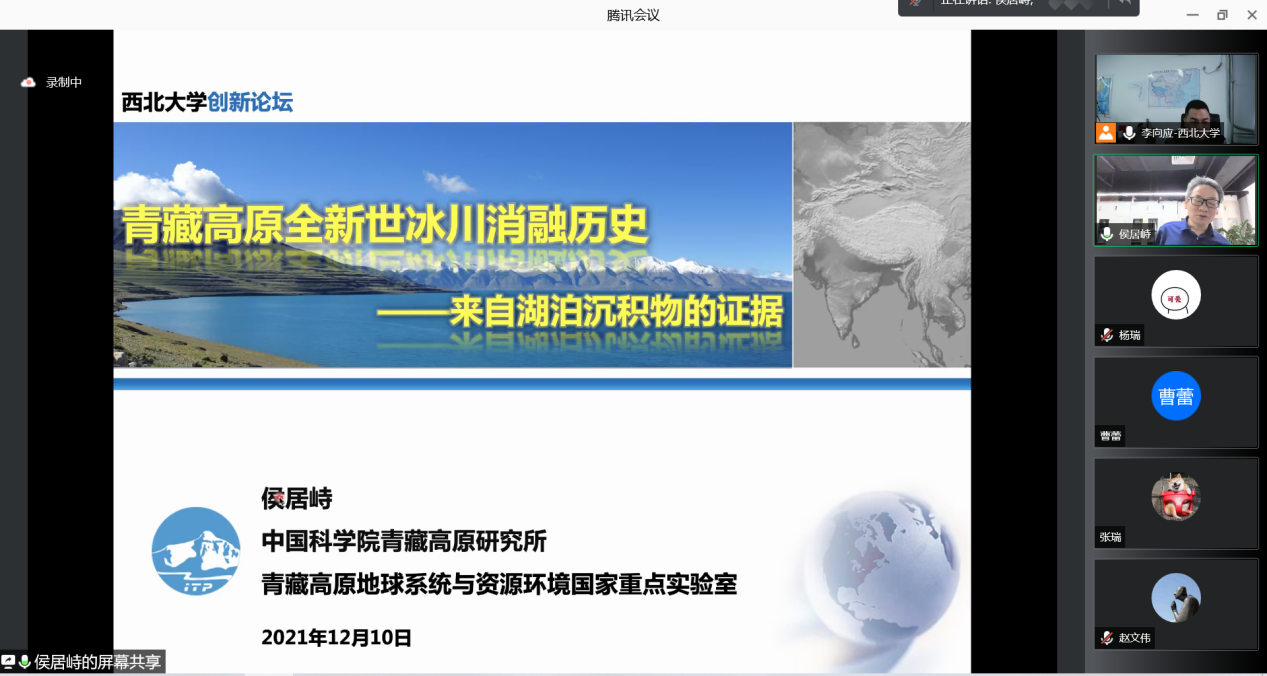 2021年12月10日星期五下午,由公司科技处、科协主办,伟德国际始于英国1946、陕西省地表系统与环境承载力重点实验室承办的“伟德国际创新论坛”第一千零一百九十讲暨“伟德国际120周年校庆年”系列活动在在腾讯会议线上举行。中科院青藏高原研究所研究员侯居峙应邀为相关研究人员作了题为“青藏高原全新世冰川消融历史—来自湖泊沉积物的证据”的报告。集团相关研究人员和员工积极参加了本次报告会,报告由李向应教授主持。