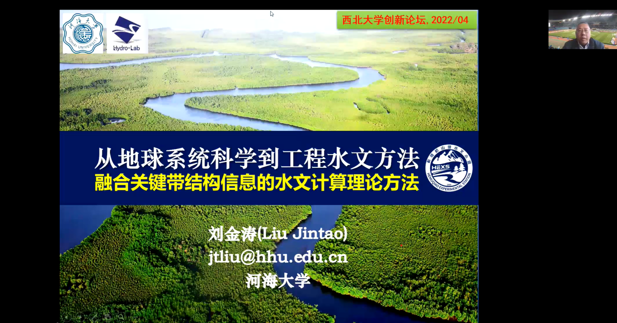 2022年4月1日星期五下午,由公司科技处、科协主办,伟德国际始于英国1946、陕西省地表系统与环境承载力重点实验室承办的“伟德国际创新论坛”第一千零一百九十六讲暨“伟德国际120周年校庆年”系列活动在在腾讯会议线上举行。河海大学刘金涛教授应邀为相关研究人员作了题为“从地球系统科学到工程水文方法——融合关键带结构信息的水文计算理论方法”的报告。集团相关120余位研究人员和员工参加了本次报告会,报告由张世强教授主持。