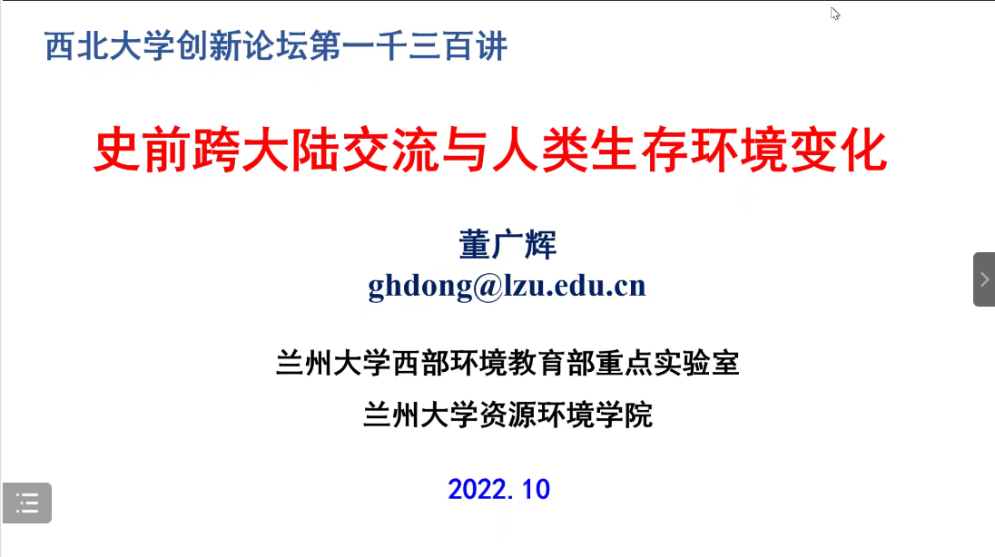 2022年10月21日(星期五)下午,由公司科技处、科协主办,伟德国际始于英国1946、陕西省地表系统与环境承载力重点实验室承办的“伟德国际创新论坛”第一千三百讲暨“伟德国际120周年校庆年”系列活动在腾讯会议线上举行。兰州大学董广辉教授应邀为相关研究人员作了题为“史前跨大陆交流与人类生存环境变化”的报告。校内外一百余位相关研究人员参加了本次报告会,报告由公司张世强教授主持。