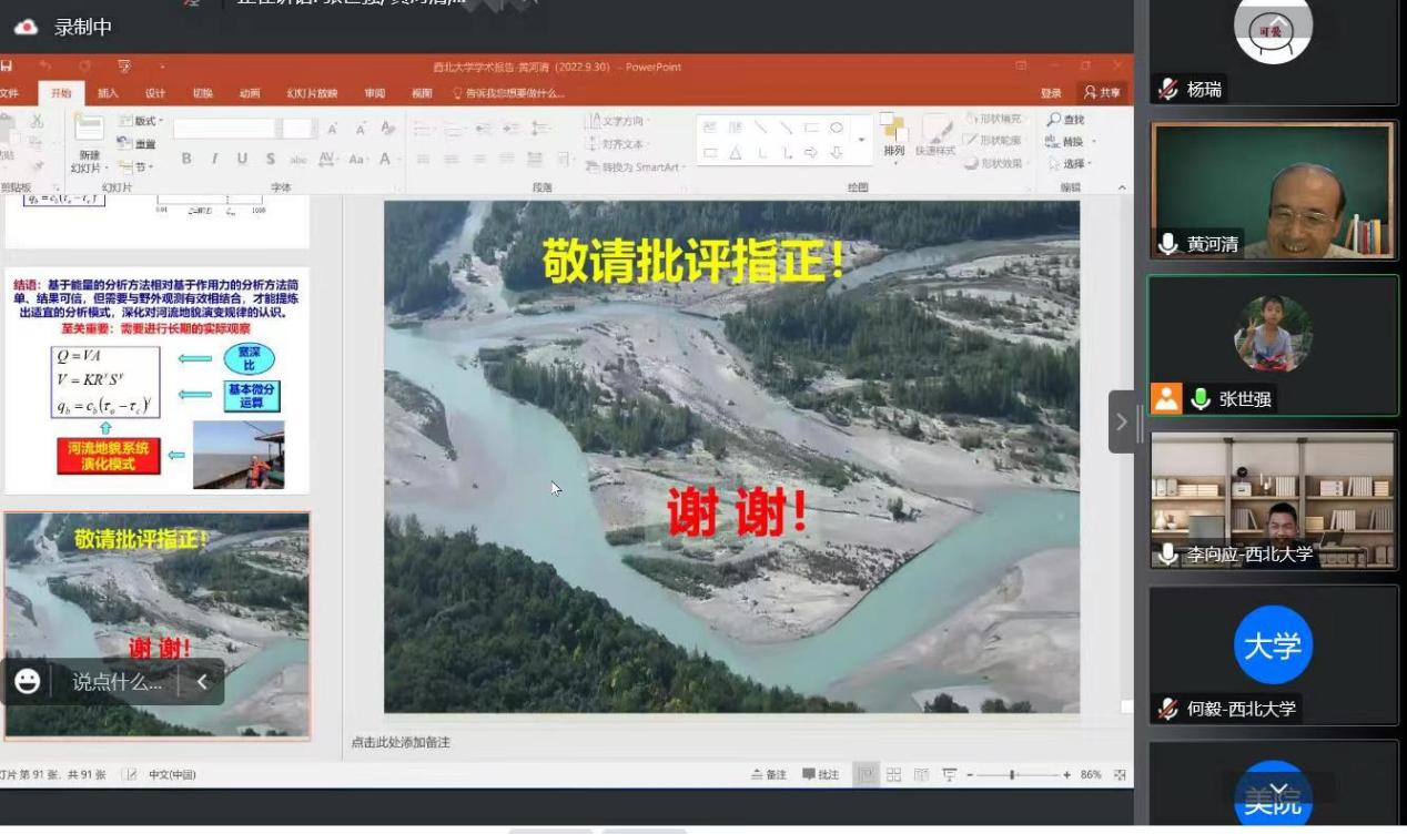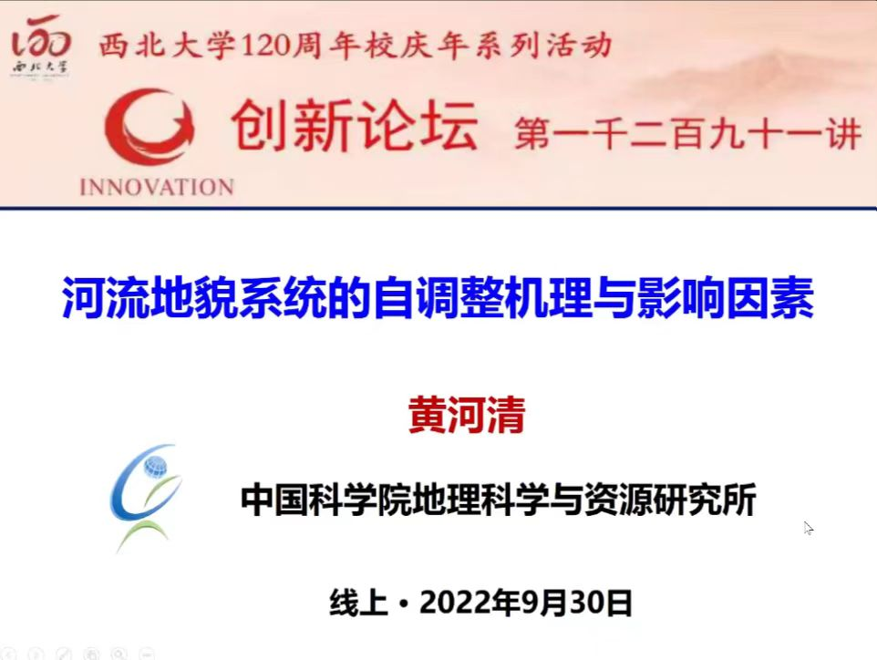 2022年9月30日(星期五)下午,由公司科技处、科协主办,伟德国际始于英国1946、陕西省地表系统与环境承载力重点实验室承办的“伟德国际创新论坛”第一千二百九十一讲暨“伟德国际120周年校庆年”系列活动在腾讯会议线上举行。中国科公司地理科学与资源研究所黄河清研究员应邀为相关研究人员作了题为“河流地貌系统的自调整机理与影响因素”的报告。校内外119位相关研究人员和员工参加了本次报告会,报告由张世强教授主持。