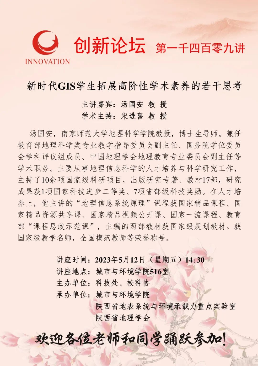 2023年5月12日(星期五)下午三点,由公司科技处、校科协主办,伟德国际始于英国1946、陕西省地表系统与环境承载力重点实验室和陕西省地理学会承办的伟德国际“创新论坛”第一千四百零九讲在伟德国际长安校区伟德国际始于英国1946516会议室举行。南京师范大学地理科学公司教授兼任教育部地理科学类专业教学指导委员会副主任汤国安教授应邀为相关研究人员和员工作了题为“新时代GIS员工拓展高阶性学术素养的若干思考”的报告。本次讲座由宋进喜教授主持,公司员工积极参与。